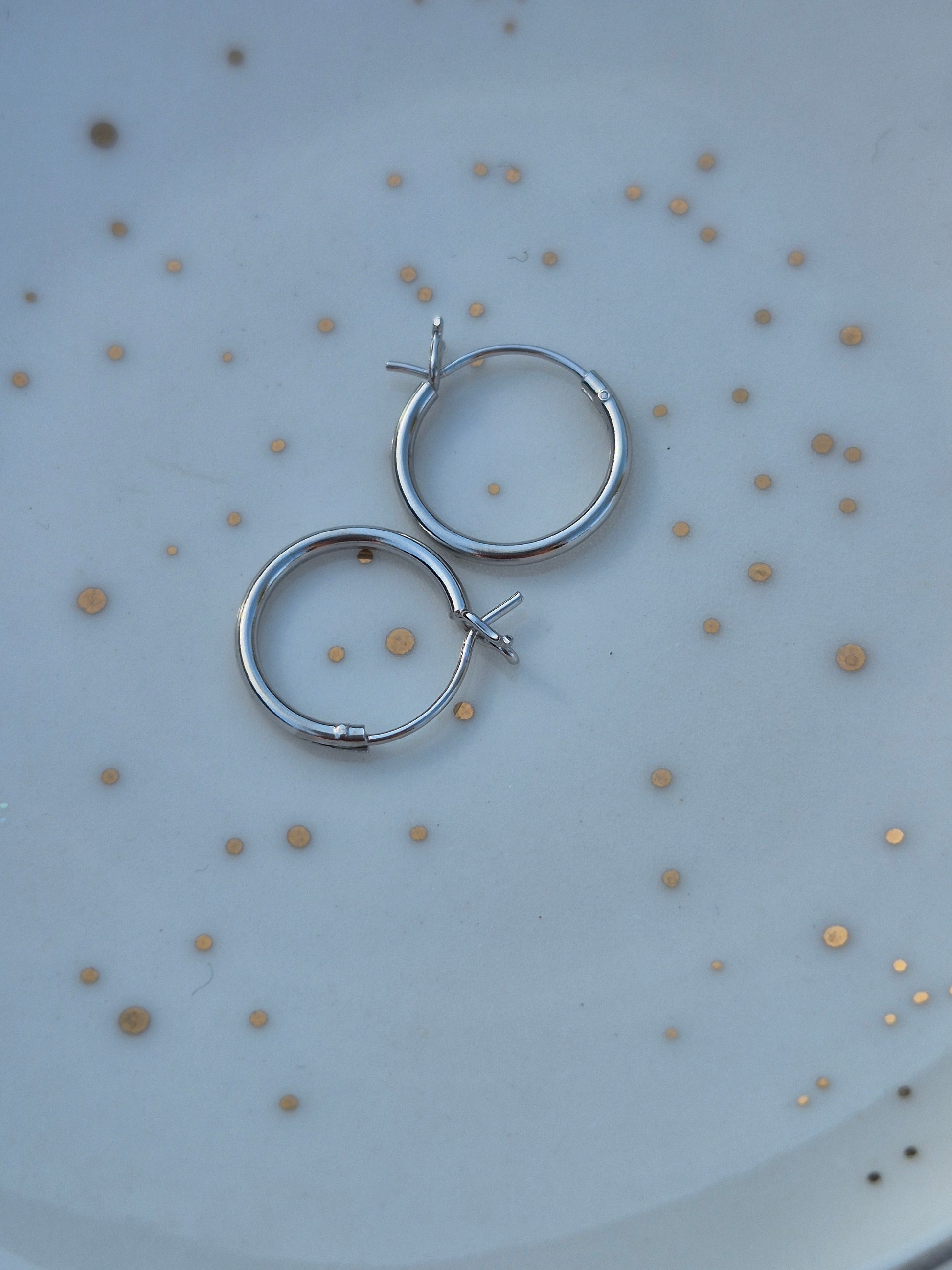 Sterling Silver plain hoop earring with a Rhodium Plated finish. These earrings are 1.2 mm x 12 mm and weigh just 0.45g. They are the perfect everyday earring!
